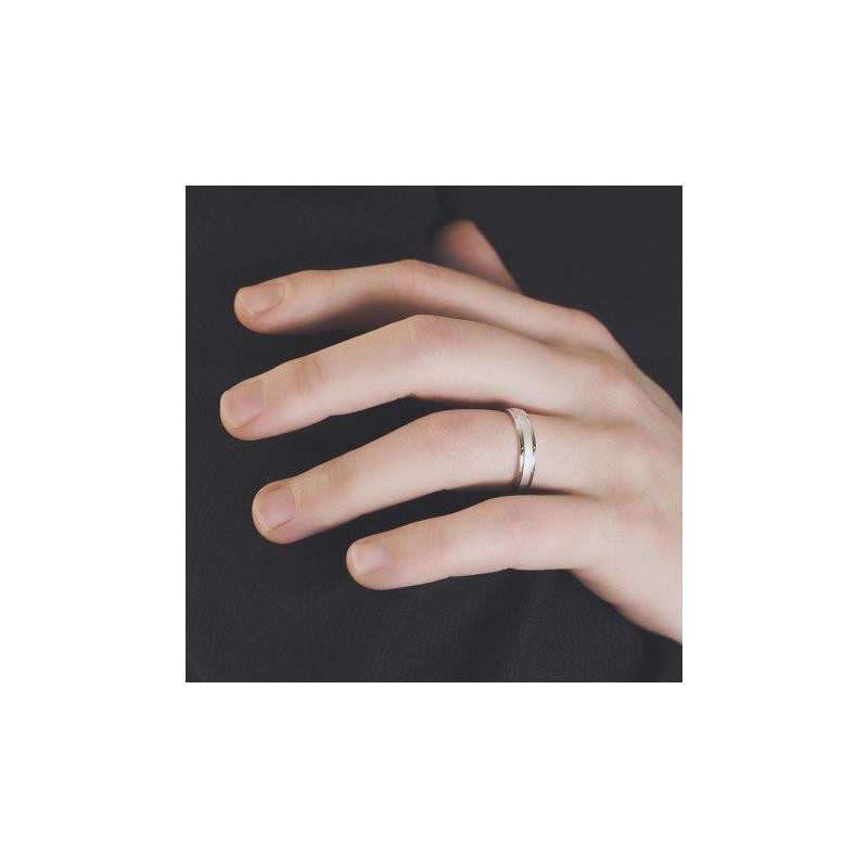 Alianza de boda de oro blanco de 18kt cuyo sencillo diseño consiste en una banda central mate sobre un acabado brillo visible en los laterales. Anchura: 4 milímetros. Interior plano. A esta alianza se le puede añadir un diamante talla brillante de 0.02ct color H, pureza SI. Solicitela con la referencia 5B40044D