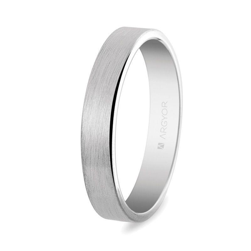 Alianza clásica plana de oro blanco de 18K modelo 5B40150S de 4 mm de ancho. Cuenta con un acabado mate satinado y un interior plano. A esta alianza se le puede añadir un diamante talla brillante de 0.02ct color H, pureza SI. O añadir un diamante talla princesa de 0.03ct color H, pureza SI