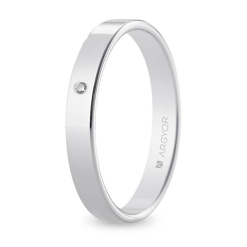 Alianza oro blanco de 18k. Anchura 3.00mm. Perfil plano. Acabado exterior brillo. 1 diamante talla brillante de 0.015ct