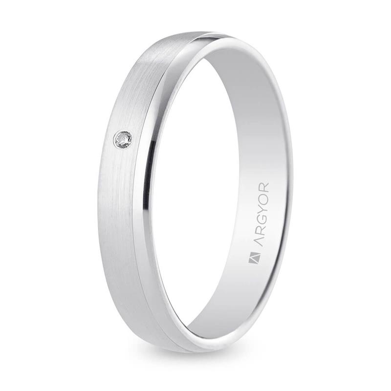 Alianza oro blanco de 18k. Anchura 4.00mm. Media caña con bisel. Acabado combinado brillo/scotch. 1 diamante talla brillante de 0.01ct