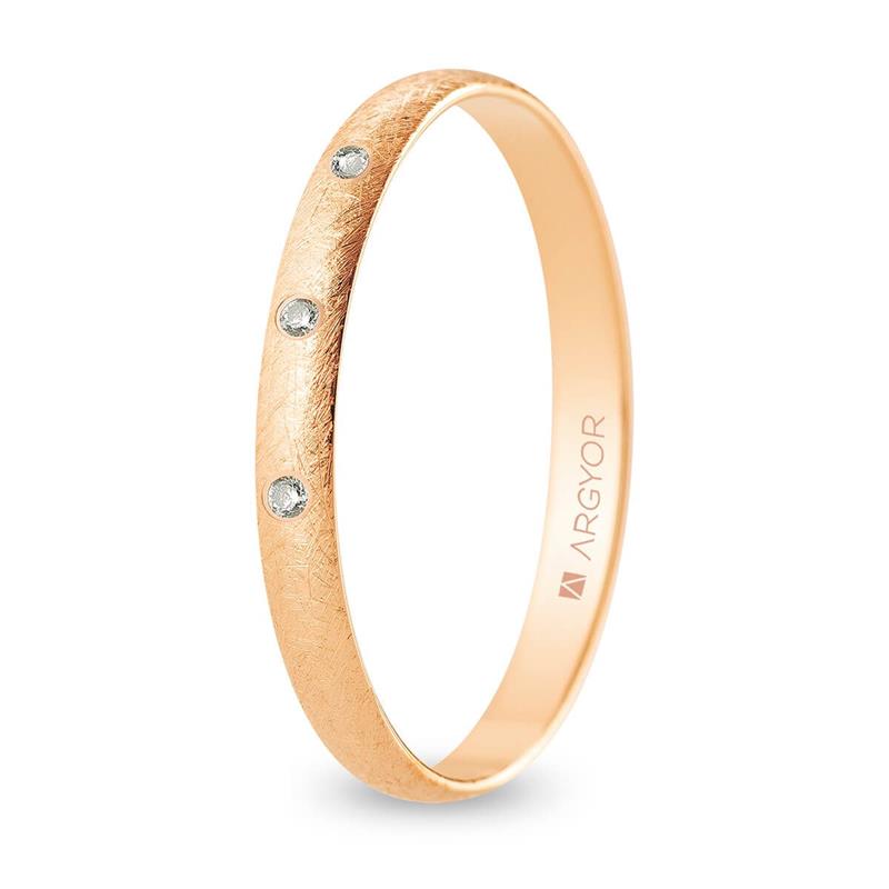 Alianza de boda. Forma media caña. Anchura 2,5mm interior plano. Fabricada en oro rosa de 18k con acabado hielo.Engastada con 3 diamantes total 0.03ct talla brillante color H, pureza SI. Modelo A25RH3D