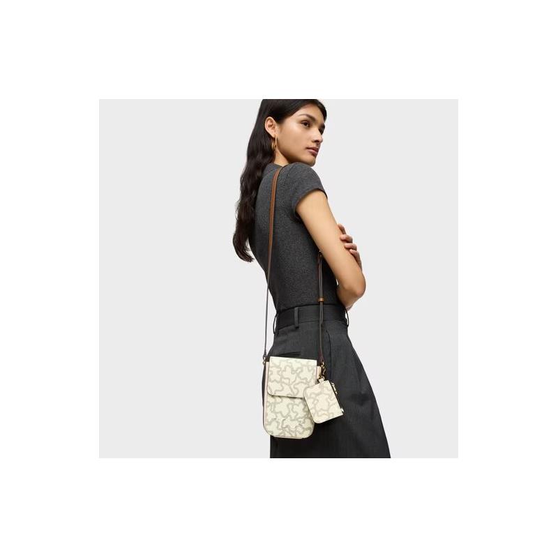 Funda de Móvil colgante TOUS para mujer de la colección Kaos Icon fabricada en piel sintética en color beige. Esta atractiva funda cuenta con cierre exterior mediante botón magnético y posee 2 ranuras para tarjetas, una de ellas transparentes. Su asa de bandolera es ajustable.