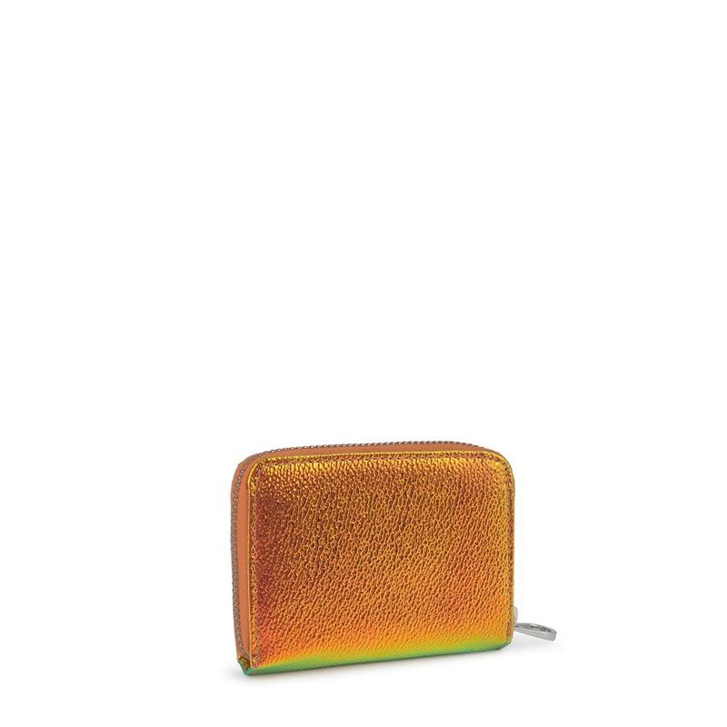 Monedero TOUS para mujer en tamaño mediano de la colección Dorp fabricado en vinilo efecto piel acabado en charol en color naranja iriscente. Cuenta con cierre de cremallera y apliques en color plata. En su interior posee 3 compartimentos y 2 bolsillos.