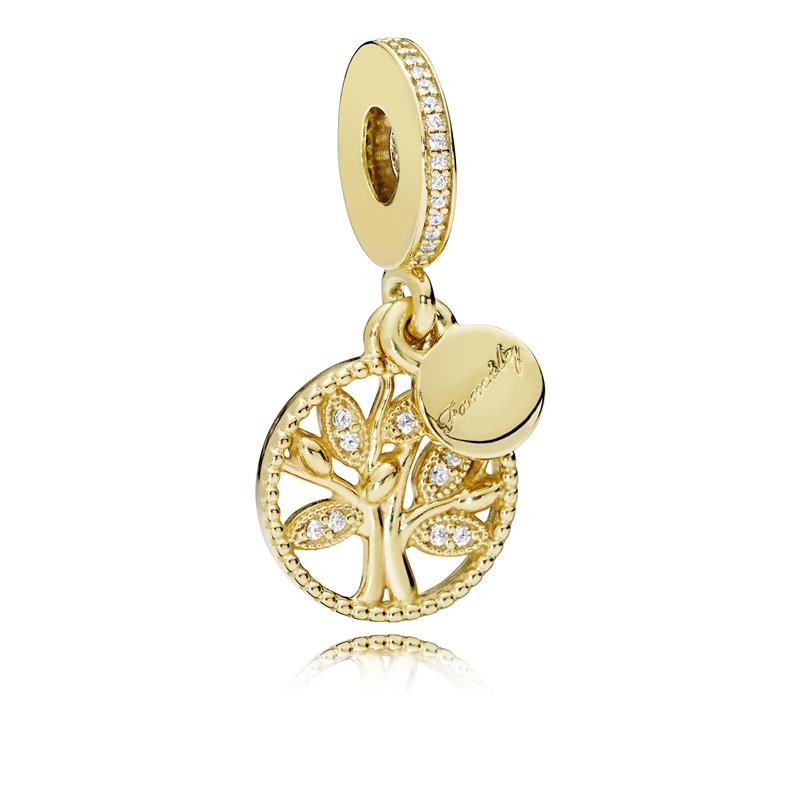 Charm colgante PANDORA Shine Herencia Familiar, hecho en plata de primera ley, bañado en oro de 18 quilates y adornado con circonitas cúbicas transparentes y grabado "Family". Un tierno charm que daránotoriedad a la familia por su significado.