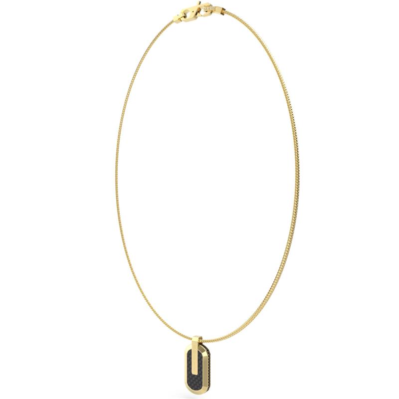 Collar Guess para hombre de la colección Racer Tag fabricada en acero inoxidable bañada en oro amarillo con una elegante cadena que da lugar a un colgante ovalado compuesto por cristales negros. Su cierre es de mosquetón.