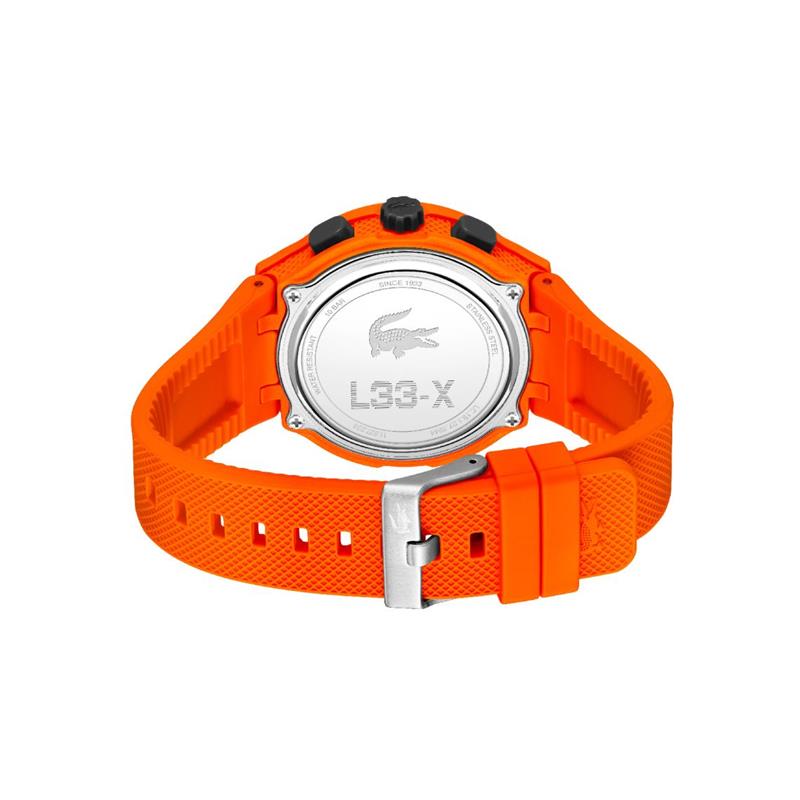 Reloj Lacoste para hombre de la colección L33-X fabricado en TR90 y silicona en color naranja. Estamos ante un reloj de diseño atrevido compuesto por caja de 45mm en color naranja con esfera verde que cuenta con indicadores en forma de barras en color naranja y agujas luminiscentes movidas por mecanismo analógico. En su esfera podemos encontrar subesferas de mecanismo digital. Todo ello protegido por cristal mineral. Su correa es de silicona en color naranja con cierre de hebilla. Resistente al agua hasta 10 ATM.