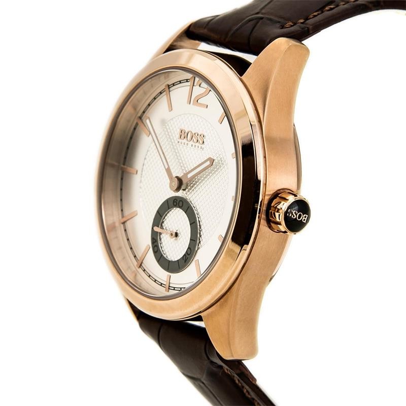 Un reloj que refleja la elegancia y sofisticación propia de la firma Hugo Boss. Su caja de acero en color rosado combina a la perfección con la esfera plateada con doble textura, creando un efecto increíble. El toque clásico lo vemos en su correa de piel marrón con un brillo espectacular. No necesitarás añadir nada más a tu look para triunfar y ser el hombre con más estilo.