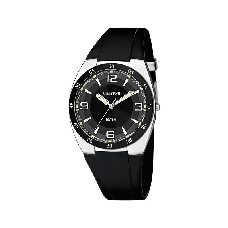 Reloj Calypso para hombre Street Style fabricado en caucho y acero inoxidable. Se trata de un reloj de diseño elegante pero a la vez original y atrevido, posee caja de acero inoxidable de 39,75 mm de diámetro en color plateado con esfera negra y diales con agujas blancas movidas por mecanismo de cuarzo analógico protegido por cristal mineral. Su correa es de caucho en color negro con cierre de hebilla. Resistente alagua hasta 10 metros.
