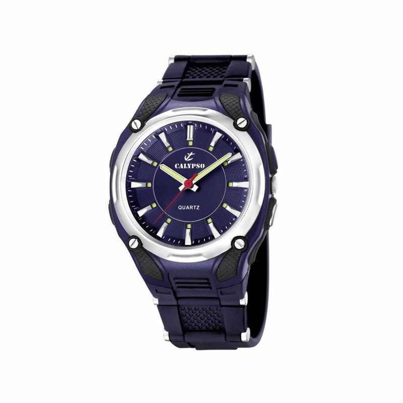 Reloj Calypso para hombre de la colección Street Style fabricado en PVC y caucho. Estamos ante un reloj de diseño deportivo y atractivo compuesto por caja de 41,7 mm con bisel plateado y esfera azul que cuenta con indicadores plateados y agujas movidas por mecanismo de cuarzo analógico protegido por cristal mineral. Su correa es de caucho en color azul con cierre de hebilla. Resistente al agua hasta 10 ATM.