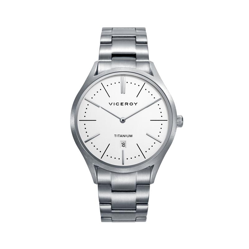 Reloj Viceroy para hombre de la colección Grand fabricado en titanio platedo. Estamos ante un reloj de diseño clásico y elegante compuesto por caja de 41mm de diámetro con esfera blanca que contiene índices y agujas en plateado movidas por mecanismo de cuarzo analógico con función de cronógrafo. Todo ello protegido por cristal mineral. Su armis lo forman eslabones de titanio plateados con cierre de mariposa. Resistente al agua hasta 5 ATM.