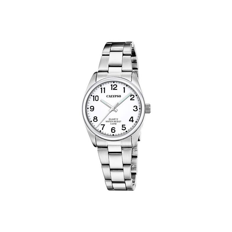Reloj Calypso para mujer de la colección Basic fabricado en acero inoxidable plateado. Este atractivo reloj cuenta con caja de 32mm de diámetro con bisel plateado que contiene esfera blanca con números en color plateado al igual que sus agujas movidas por mecanismo de cuarzo analógico. Todo ello protegido por cristal mineral. Su brazalete lo forman eslabones plateados con cierre desplegable mediante doble pulsador. Resistente al agua hasta 5 ATM.