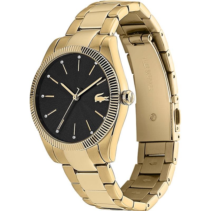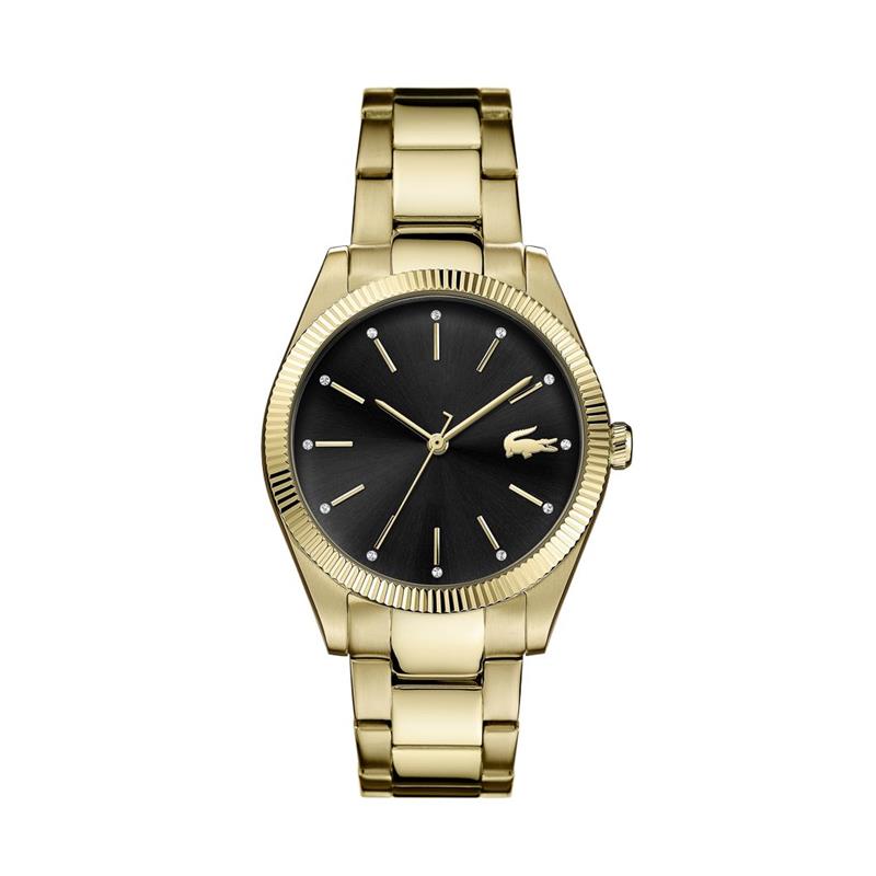 Reloj Lacoste para mujer de la colección Parisienne fabricado en acero inoxidable con elegante baño de oro. Estamos ante un elegante y lujoso reloj compuesto de caja de acero inoxidable bañada en oro de 36mm de diámetro con esfera negra en contraste con sus diales y agujas bañadas en oro movidas por mecanismo de cuarzo analógico protegido por cristal mineral. Su correa está compuesta por eslabones y posee cierre desplegable. Resistente al agua hasta 30 metros.