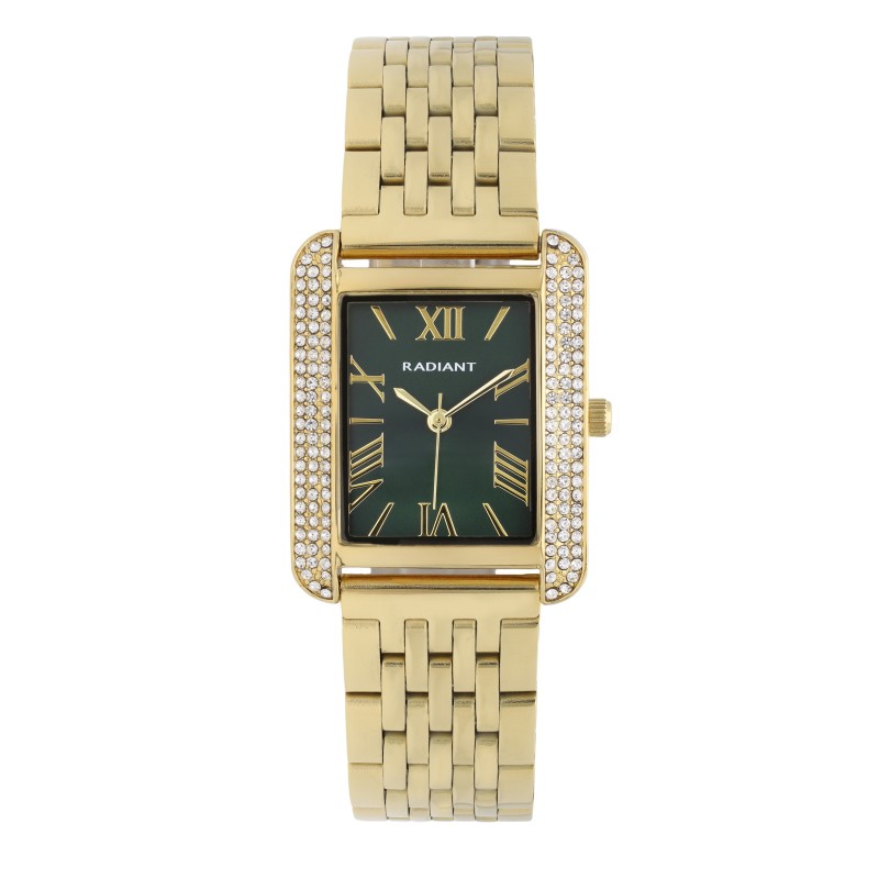 Reloj Radiant para mujer de la colección After Glow fabricado en acero inoxidable dorado. Estamos ante un atractivo reloj compuesto por caja rectangular de 27 mm de ancho con bisel dorado con cristales brillantes. Su esfera es verde con números romanos en dorado al igual que sus agujas movidas por mecanismo de cuarzo analógico. Todo ello protegido por cristal mineral. Su brazalete lo forman eslabones dorados con cierre desplegable mediante doble pulsador. Resistente al agua hasta 3 ATM.