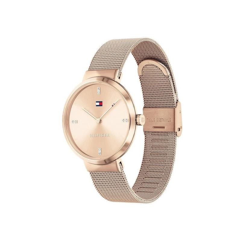 Reloj Tommy Hilfiger para mujer de la colección Liberty fabricado en acero inoxidable con baño rosado. Estamos ante un reloj de máxima elegancia y atractivo de diseño puramente femenino, cuenta con caja con baño rosado de 35mm de diámetro, su esfera rosada cuenta con diales compuestos de circonitas brillantes y sus agujas rosadas son movidas por mecanismo de cuarzo protegido por cristal mineral. Su correa es de malla milanesa en baño rosado con cierre de broche. Resistente al agua hasta 20 metros.