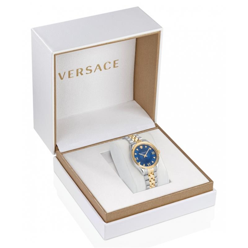 Reloj Versace para mujer de la colección Hellenyium fabricado en acero inoxidable plateado y dorado. Estamos ante un reloj de diseño elegante y atractivo compuesto por caja de 35mm de diámetro con bisel dorado que contiene esfera azul con indicadores y agujas en dorado movidas por mecanismo de cuarzo analógico. Todo ello protegido por cristal de Zafiro. Su brazalete lo forman eslabones en acero bicolor con cierre desplegable. Resistente al agua hasta 5 ATM.