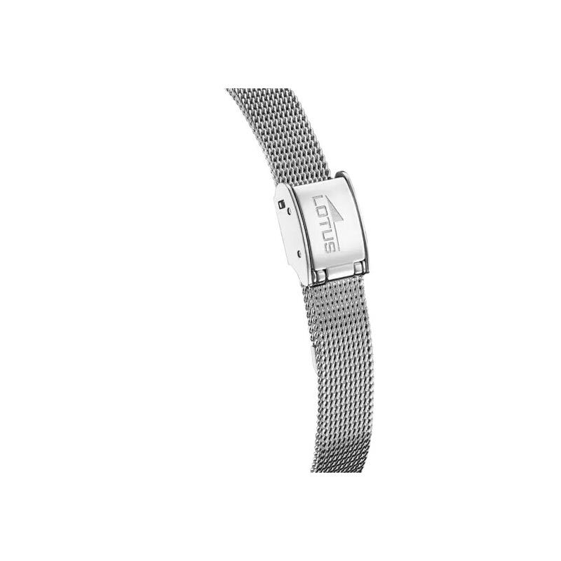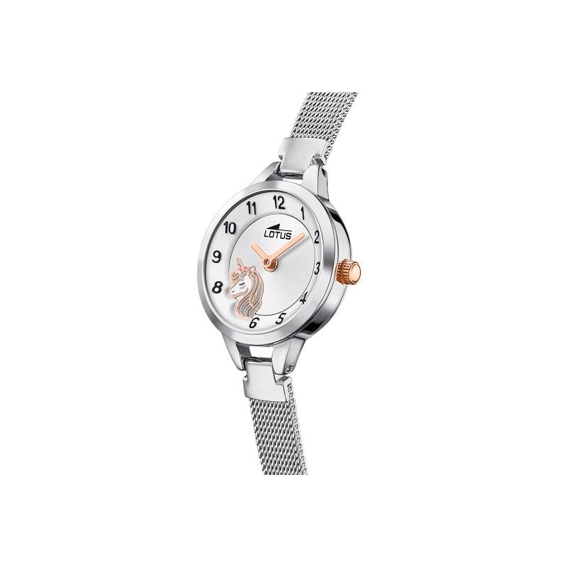 Reloj Lotus para niña de la colección Junior fabricado en acero inoxidable plateado. Se trata de un original y atractivo reloj compuesto por caja de 25mm de diámetro con caja plateada con un detalle en rosado en forma de unicornio y con índices en color negro con agujas en rosado movidas por mecanismo de cuarzo analógico. Todo ello protegido por cristal mineral. Su correa es de malla milanea con cierre ajustable. Resistente al agua hasta 50 metros.
