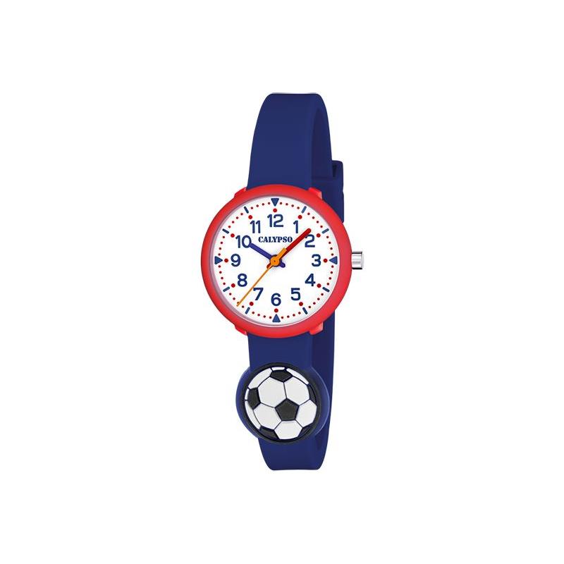 Reloj Calypso para niña de la colección My First Watch fabricado en caucho color azul y rojo. Estamos ante un atractivo reloj de diseño infantil compuesto por caja de 29mm de diámetro con bisel rojo y esfera blanca que contiene números en color azul con agujas multicolor movidas por mecanismo de cuarzo analógico protegido por cristal mineral. Su correa es de caucho en color azul con un balón y cierre de hebilla. Resistente al agua hasta 3 ATM.