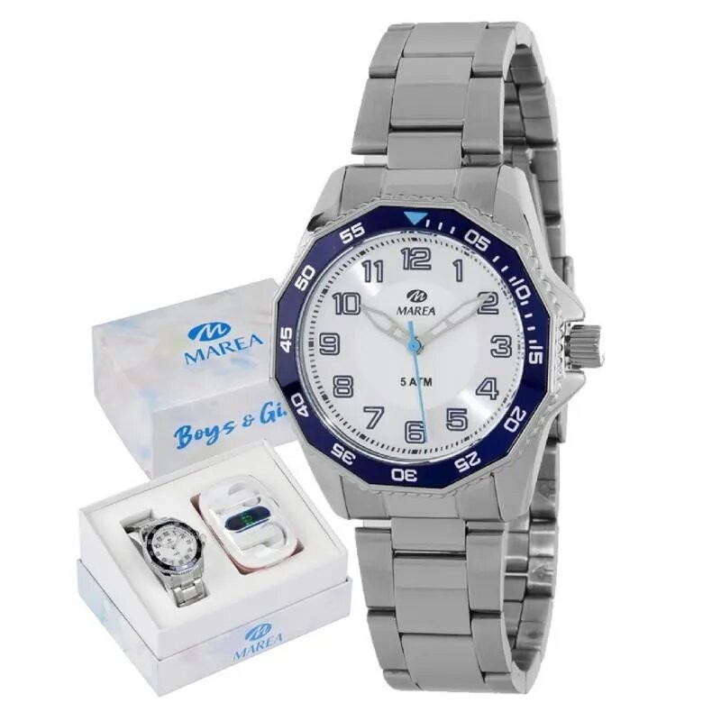 Reloj Marea para niño de la colección de Comunión fabricado en acero inoxidable plateado y azul. Estamos ante un reloj de diseño elegante y atractivo compuesto por caja de 34mm de diámetro con bisel azul al igual que su esfera compuesta por indicadores y agujas luminiscentes movidas por mecanismo de cuarzo analógico. Todo ello protegido por cristal mineral. Su brazalete lo forman eslabones plateados con cierre desplegable mediante pulsadores. Resistente al agua hasta 5 ATM. Incluye auriculares inalámbricos.