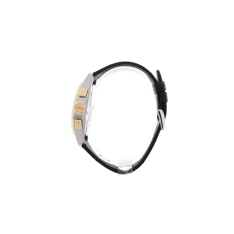 Reloj Emporio Armani para hombre de la colección Caludio fabricado en acero inoxidable negro, plateado y dorado. Estamos ante un reloj de diseño original y atractivo compuesto por caja dorado de 43mm de diámetro con esfera plateado que contiene índices y agujas en dorado luminiscentes movidas por mecanismo de cuarzo analógico con función de cronógrafo y calendario. Todo ello protegido por cristal mineral. Su correa es de piel en color negro con cierre de hebilla. Resistente al agua hasta 50 metros.