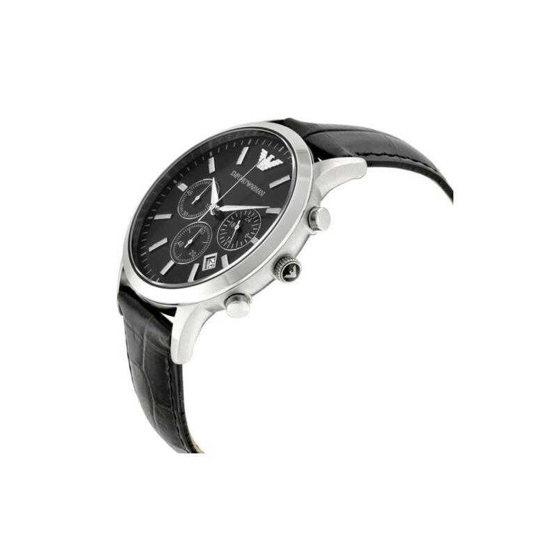 Reloj Emporio Armani para hombre de la colección Renato fabricado en acero inoxidable plateado y piel negra. Estamos ante un reloj de diseño clásico y elegante compuesto por caja de 43mm de diámetro con esfera negra que contiene índices y agujas en plateado movidas por mecanismo de cuarzo analógico con función de cronógrafo y calendario protegido por cristal mineral. Su correa es de piel en color negro con cierre de hebilla. Resistente la agua hasta 50 metros.