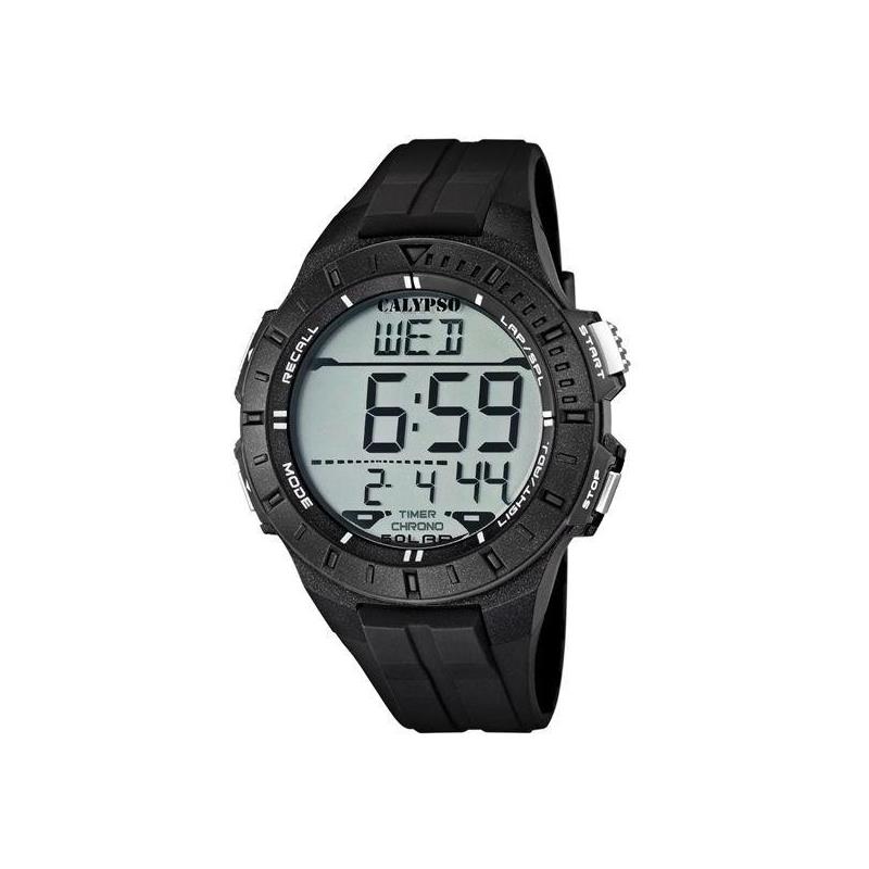 Reloj Calypso para hombre fabricado en caucho color negro. Se trata de un atractivo reloj de diseño deportivo con caja en color plateado de 48mm de diámetro con mecanismo digital protegido por cristal mineral. Su correa es de caucho en color negro con cierre de hebilla. Resistencia al agua hasta 100 metros.