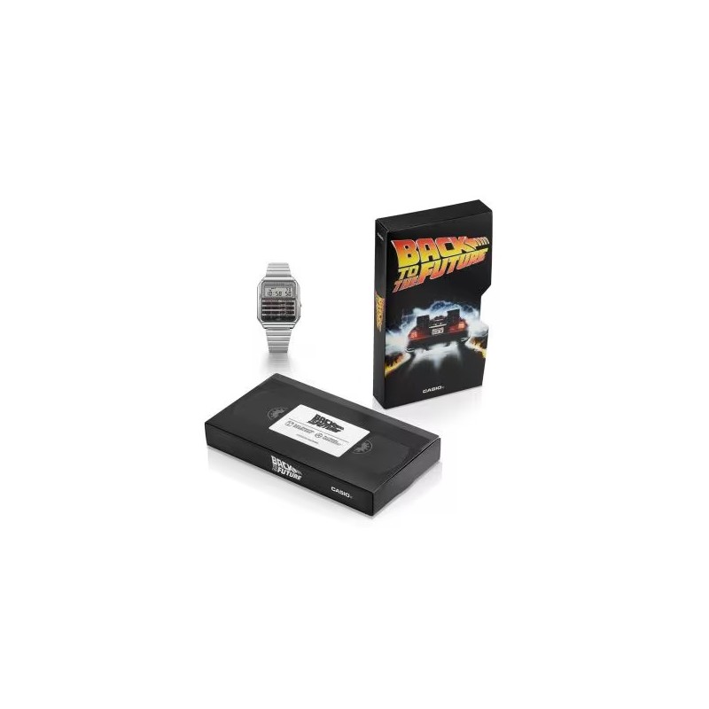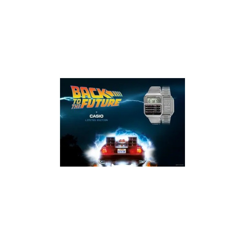 Reloj Casio Edición Limitada de la película Regreso al Futuro conmemorando su 40 aniversario. Este icónico Casio Vintage está fabricado en acero inoxidable plateado. Se trata de un reloj de diseño carismático compuesto por caja rectangular de 34,4mm de ancho con bisel plateado y esfera que cuenta con calculadora y mecanismo digital protegido por pantalla de cristal mineral. Su brazalete es de acero inoxidable en plateado con cierre desplegable . Resistente al agua.