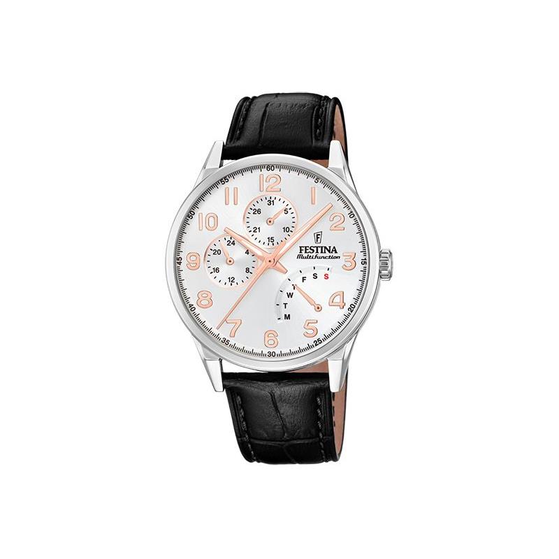 Reloj Festina para hombre fabricado en acero inoxidable plateado y rosado con piel en color negro. Este atractivo reloj de diseño elegante cuenta con caja plateada de 41mm de diámtro con esfera plateada que cuenta con indicadores y agujas en rosado movidas por mecanismo de cuarzo analógico multifunción. Todo ello protegido por cristal mineral. Su correa es de piel en color negro con cierre de hebilla. Resistente al agua hasta 3 ATM.