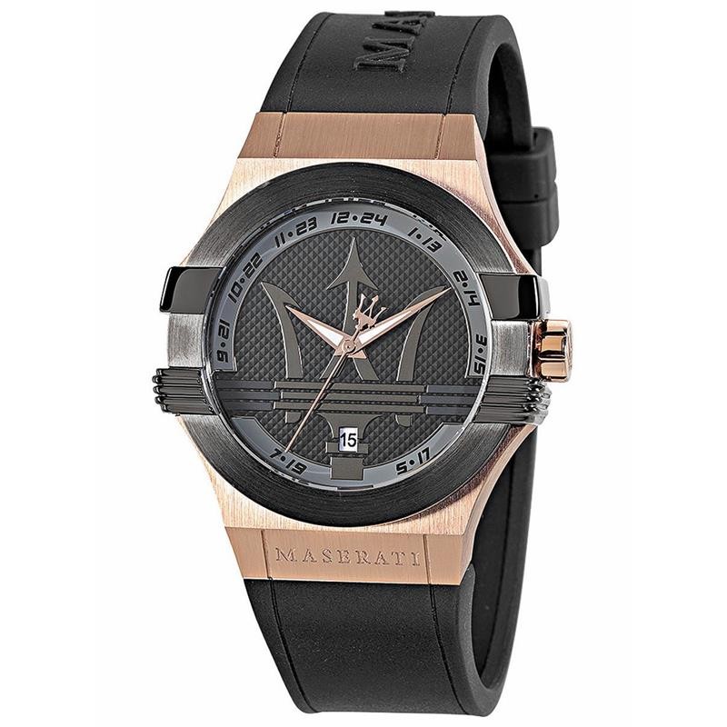 Reloj Maserati para hombre de la colección Potenza fabricado en acero inoxidable con baño rosado y caucho negro. Se trata de un reloj de diseño atractivo y elegante compuesto de caja de 42mm en colores negro y rosado con esfera negra que contiene el logotipo de Maserati con agujas en rosado movidas por mecanismo de cuarzo analógico con función de calendario, todo ello protegido por cristal mineral. Su correa es de caucho en color negro con cierre de hebilla. Resistente al agua hasta 100 metros.