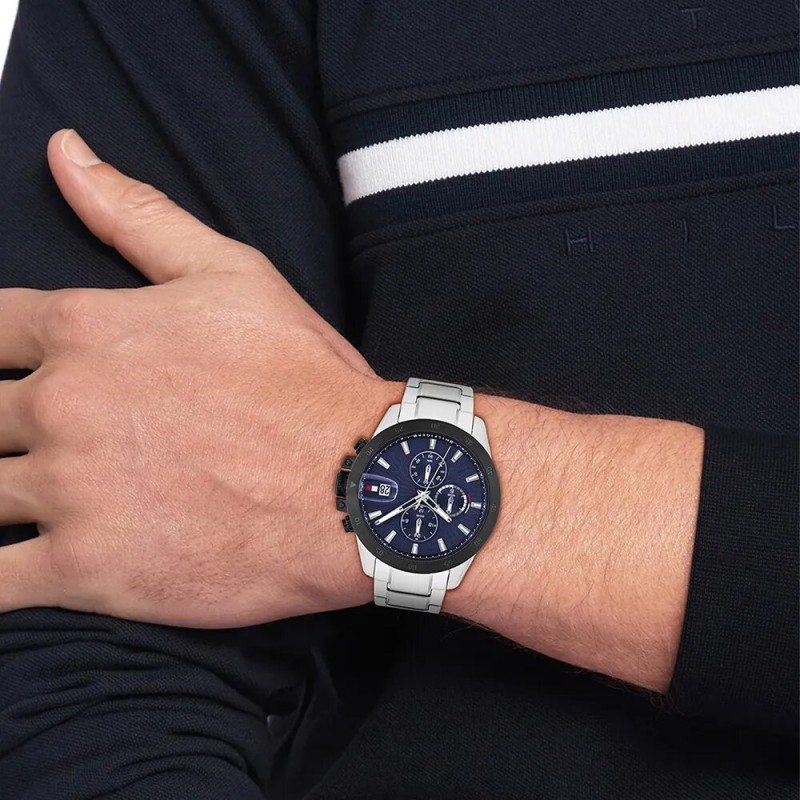 Reloj Tommy Hilfiger para hombre de la colección Jameson fabricado en acero inoxidable plateado y azul. Estamos ante un atractivo reloj compuesto por caja de 43mm de diámetro con bisel ionizado azul. Su esfera es azul marino con indicadores n forma de barras luminiscentes movidas por mecanismo de cuarzo analógico multifunción. Todo ello protegido por cristal mineral. Su brazalete lo forman eslabones plateados con cierre desplegable mediante doble pulsador. Resistente al aguah hasta 5 ATM.