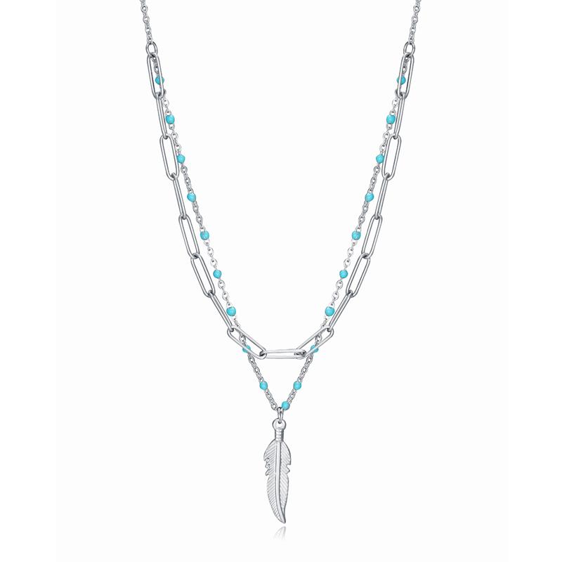Gargantilla Viceroy Fashion para mujer de la colección Kiss fabricada en acero inoxidable plateado compuesta por 2 cadenas, una de ellas formada por eslabones rectangulares mientras que la otra cadena está formada por bolitas color turquesa que dan lugar a un colgante en forma de pluma. Su cierre es de mosquetón ajustable.