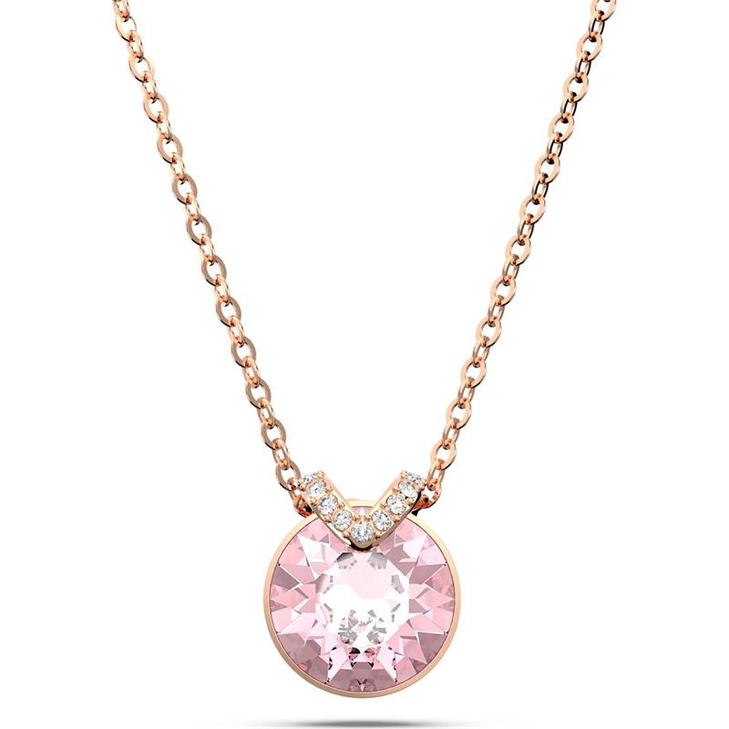 Gargantilla Swarovski para mujer de la colección Bella V fabricado en aleación de metales bañados en oro rosa compuesta por una elegante cadena que da lugar a un colgante circular con un cristal rosa y una pieza en V formada por cristales blancos. Su cierre es de mosquetón ajustable.