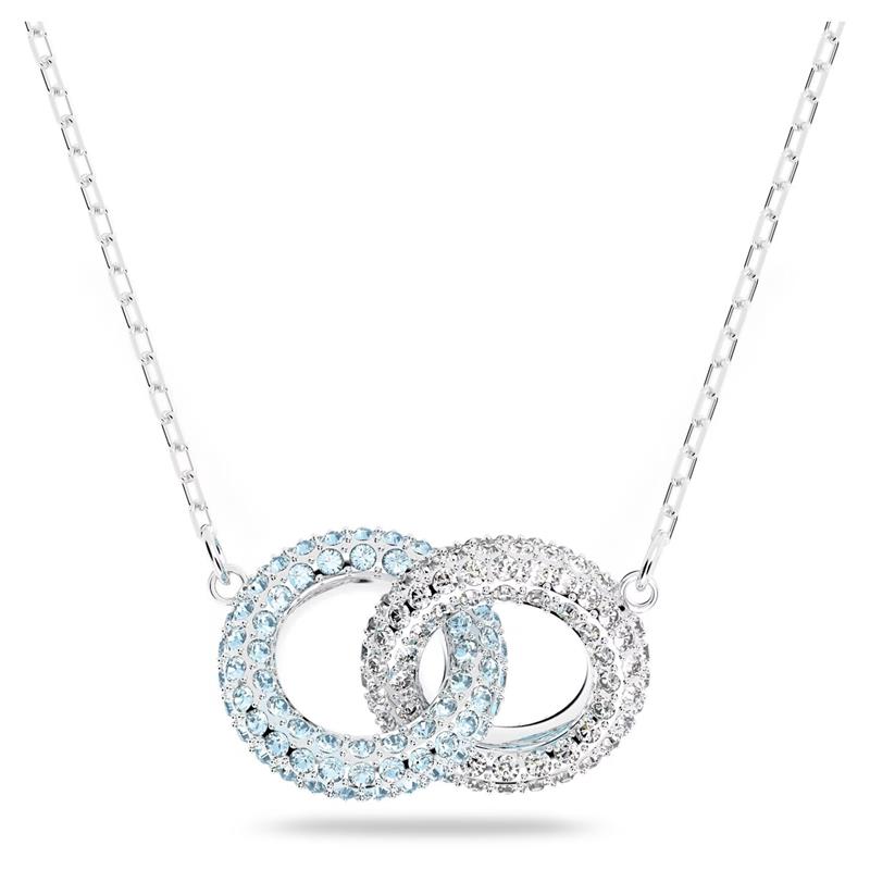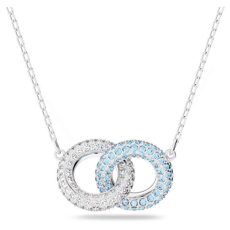 Gargantilla Swarovski para mujer modelo Stone fabricada en aleación de metales bañados en rodio formada por una elegante cadena que da lugar 2 colgantes en forma circular entrelazados, uno de ellos compuesto por cristales blancos Swarovski mientras que el otro cuenta con cristales azules Swarovski. Su cierre es de mosquetón ajustable.