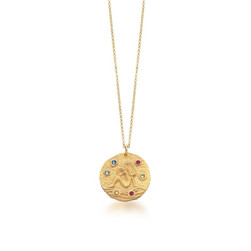 Colgante Virgo signo del zodiaco, de plata de 1ª ley con baño de oro de 18 kt. Con cadena de 45 cm aprox. Con pequeñas Swarovski de colores. Sientete especial con el colgante de tu signo del zodiaco.
