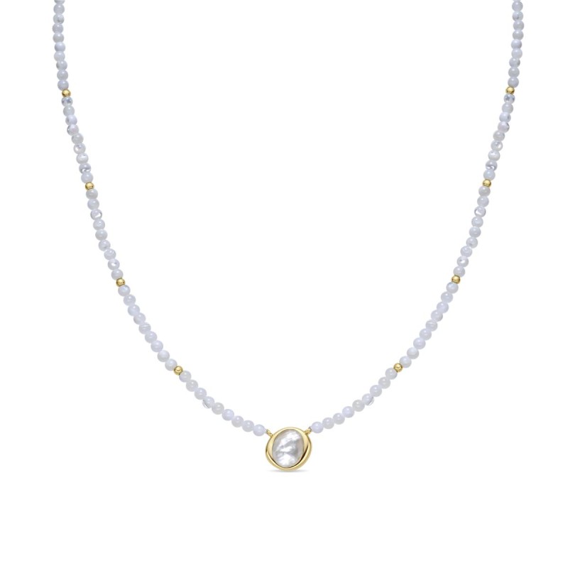 Collar Luxenter para mujer modelo Alqua fabricado en plata bañada en oro amarillo cuya cadena está formada por piedras blancas que dan lugar a un colgante en madreperla. Su cierre es de reasa ajustable mediante cadena.