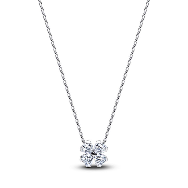 Collar Pandora Trébol de la Suerte Brillante para mujer de la colección Día de la Madre 2026 fabricados en plata compuesto por una atractiva cadena que da lugar a un colgante en forma de Trébol de la Suerte compuesto por circonitas blancas. Su cierre es de mosquetón.