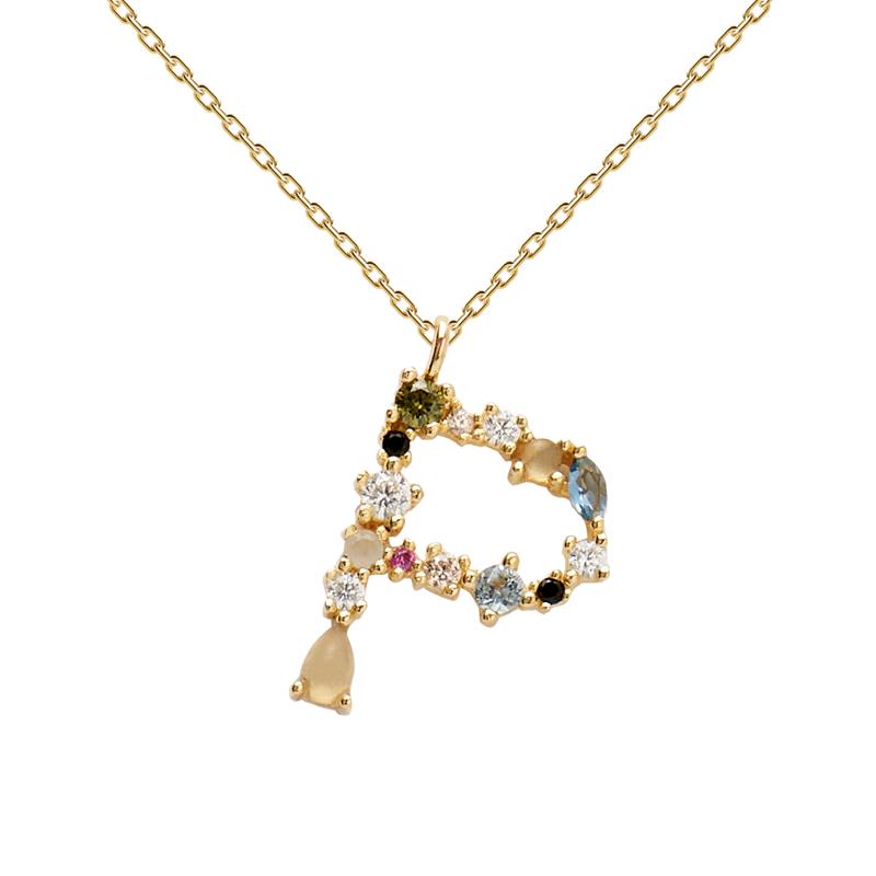 Collar PdPaola para mujer fabricado en plata con baño de oro formado por una fina cadenita bañada en oro que da lugar a un colgante de la Inical Letra P formada por piedras engastadas manualmente. Un collar atractivo que te dotará de elegancia colorido y personalidad gracias a su inicial.