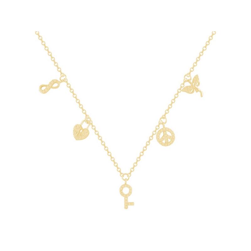 Gargantilla Itemporality para mujer de la colección Signals fabricada en plata bañada en oro compuesta por una atractiva cadena la cual contiene colgantes en forma de infinito, candado, llave, símbolo de la paz y mariposa. Todos ellos con circonitas blancas. Su cierre es de mosquetón ajustable.