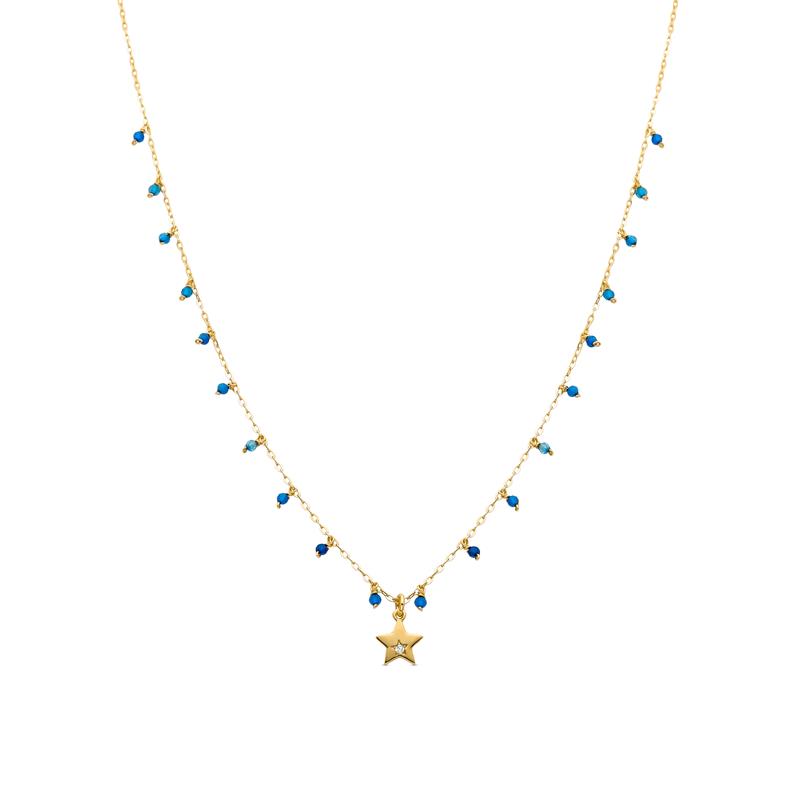 Gargantilla Luxenter para mujer modelo Zysuo fabricada en plata bañada en oro amarillo de 18Kt compuesta por una fina y elegante cadena de la cual cuelgan cristales en azul oscuro con un colgante central en forma de estrella con una circonita brillante. Su cierre es de mosquetón ajustable mediante cadena extensible.
