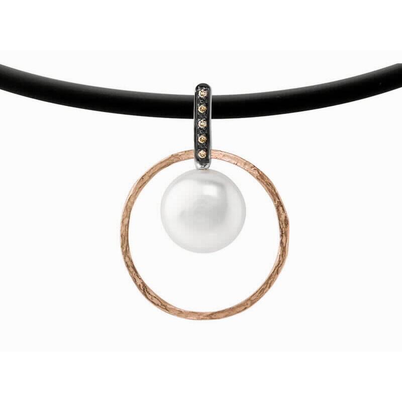 Gargantilla Marina García para mujer compuesto por un correa de cuero en color negro con un colgante circular en plata bañada en oro rosa con una elegante perla en su parte central. Su cierre es de mosquetón.