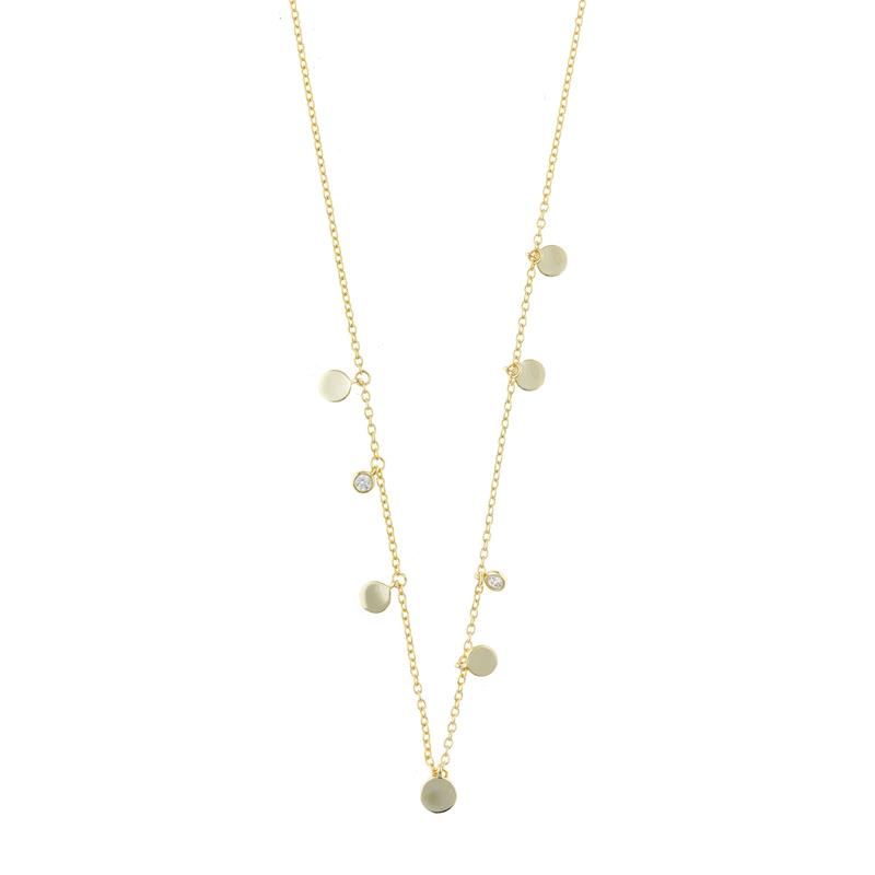 Gargantilla Salvatore para mujer fabricada en plata bañada en oro amarillo de 18kt compuesta por una cadena que contiene chapitas bañadas en oro y circonitas blancas. Su cierre es de mosquetón ajustable.