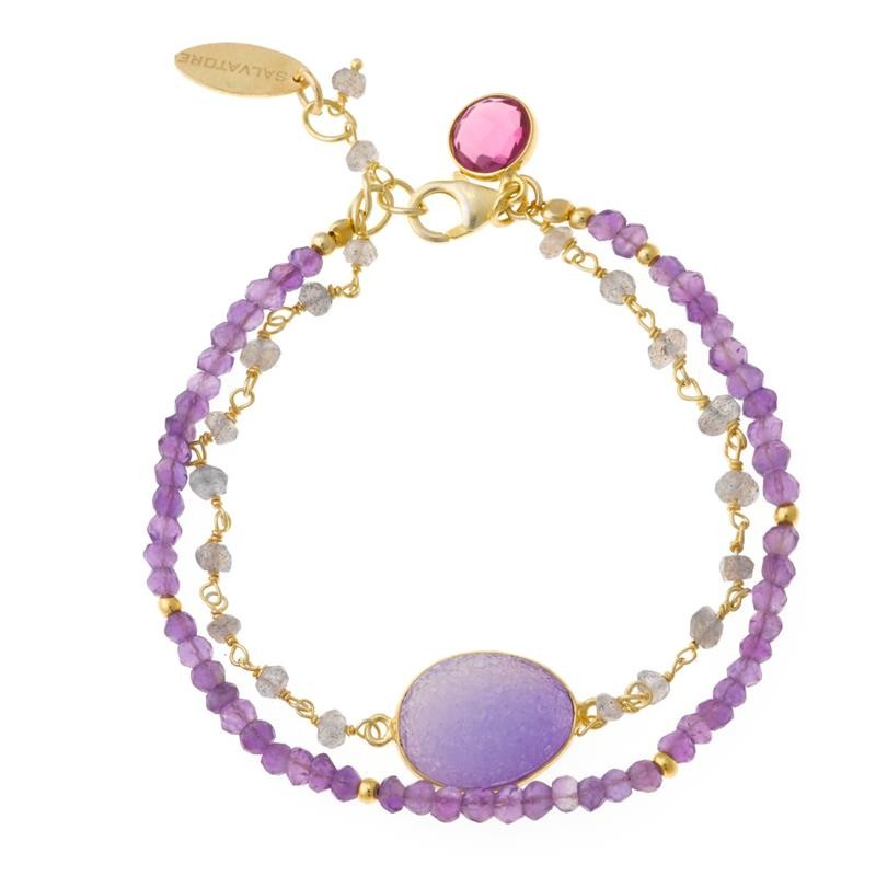 Pulsera Plata Chapado Dorado Dos Vueltas Bolitas Amatiastas Rosas Y Labradoritas Amatista Oval Turmalina Rosa Hidrotermal Redond