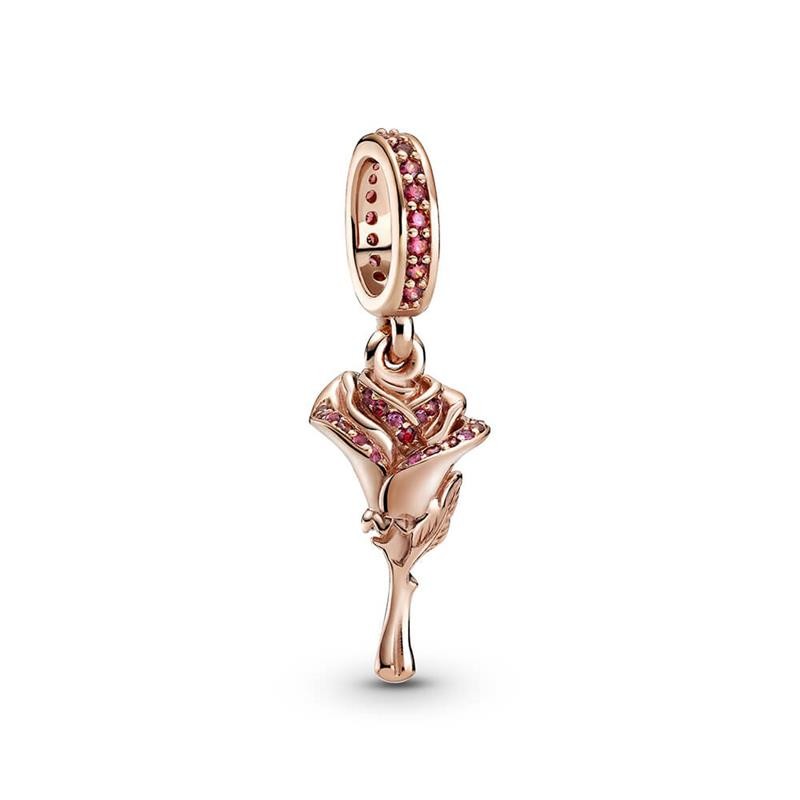 Charm Colgante Pandora Rose Flor Rosa fabricado en aleación de metales bañados en el clásico y elegante baño Pandora Rose. Se trata de un elegante y vistoso charm que llenará de glamour tu pulsera, en forma de flor con circonitas rojas que darán aún más color y brillantez a este charm.