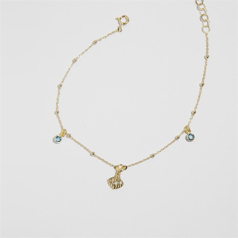 Tobillera Victoria Cruz para mujer de la colección Ocean fabricada en plata bañada en oro compuesta por una cadena de eslabones que dan lugar en su parte central a un abalorio colgante en forma de concha con cristales Swarovski y un cristal circular colgante en color Aquamarina de Swarovski. Su cierre es de mosquetón ajustable.