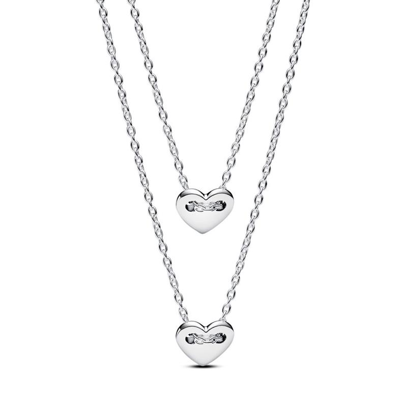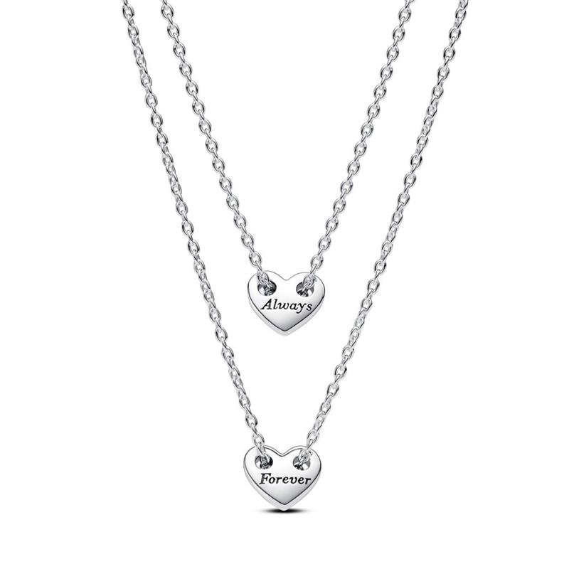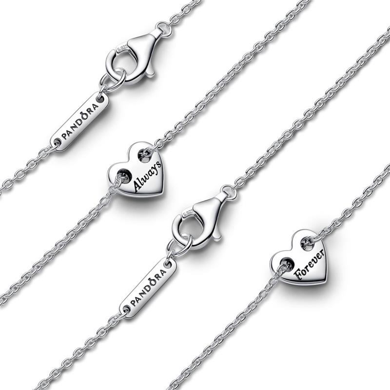 Gargantilla Pandora Doble Divisible Para Siempre para mujer de la colección Día de la Madre 2024 fabricada en plata de primera ley compuesta por una doble gargantilla, ambas acabadas en un colgante en forma de corazón con los grabados "Always" y "forever".