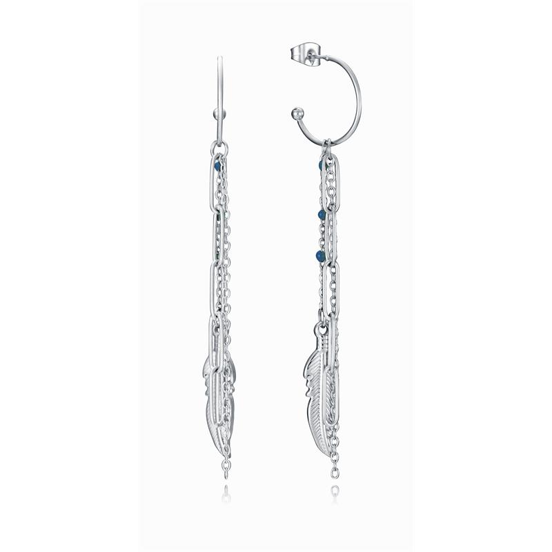 Pendientes Viceroy Fashion para mujer de la colección Kiss fabricados en acero inoxidable plateado en forma de aro del cual cuelga una doble cadena, una de ellas formada por bolitas azules y otra da lugar a un colgante en forma de pluma. Su cierre es de presión.