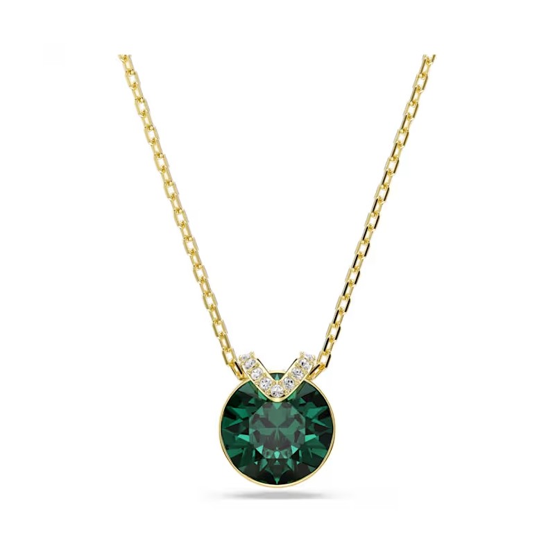 Gargantilla Swarovski para mujer de la colección Bella V fabricada en aleación de metales bañados en oro amarillo compuesta por una elegante cadena que da lugar a un colgante en forma circular compuesto por un cristal verde y pequeños cristales blancos. Su cierre es de mosquetón ajustable mediante cadena extensible.