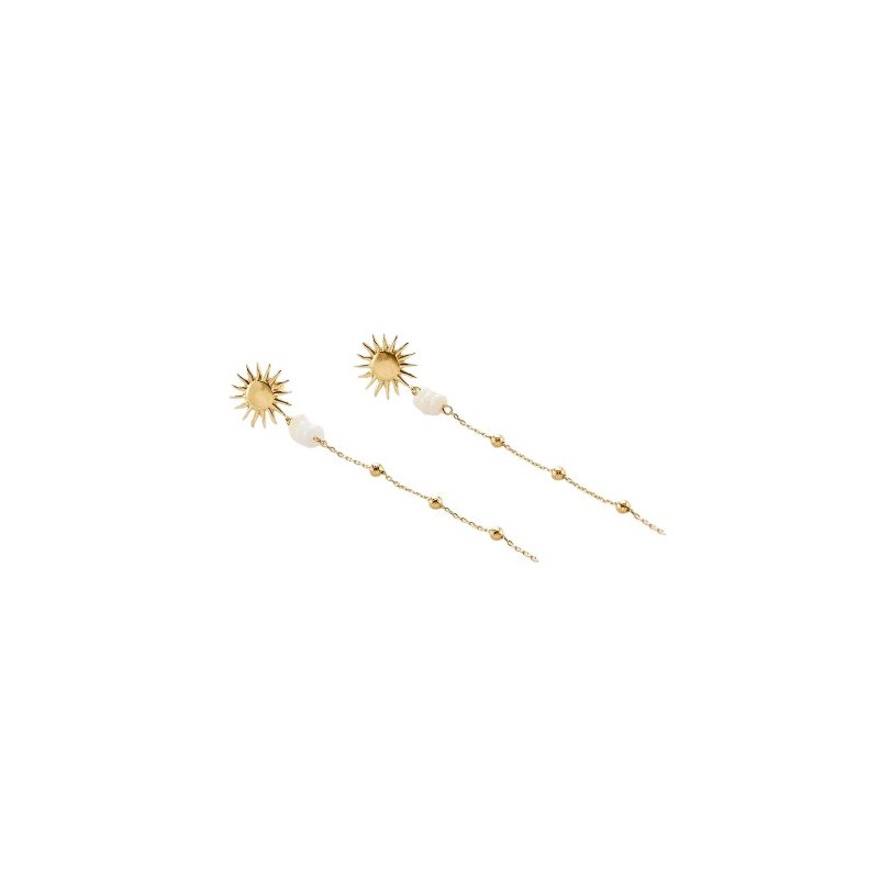 Pendientes Largos Agahta Paris para mujer de la colección Tiare de Maria Pombo X Agatha. Estos pendientes están fabricados en latón bañado en oro amarillo compuestos por un sol en su parte superior del cual cuelga una cadena con 3 perlas de nácar y bolitas salteadas. Su cierre es de presión.