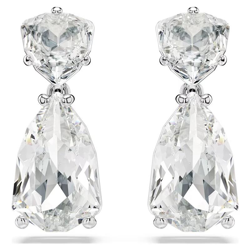 Pendientes Swarovski para mujer de la colección Mesmera fabricados en aleación de metales bañados en rodio compuestos en su parte superior por un cristal blanco engastado en 3 garras del cual cuelga otro cristal en forma de pera engastado en 4 garras. Su cierre es de presión.