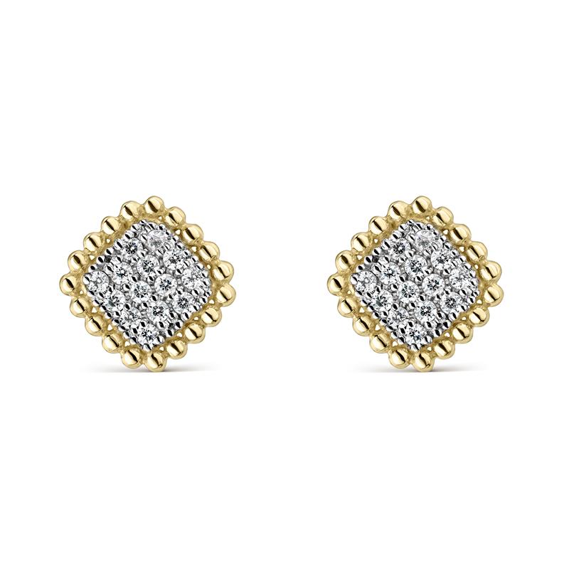 Pendientes Litta Fiore para mujer de la colección Art Decó fabricados en oro amarillo en forma de cuadrado compuesto por bolitas en cada uno de sus cuatro lados y circonitas sobre pavé rodiado en su parte interior. Su cierre es de presión.