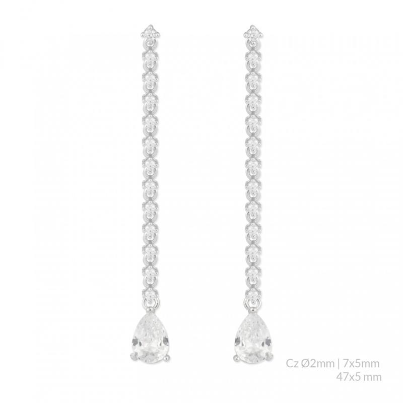 Pendientes para mujer fabricados en plata bañada en rodio compuestos por una hilera colgante formada por circonitas blancas en talla brillante que dan lugar a una circonita en talla de lágrima. Su cierre es de presión.